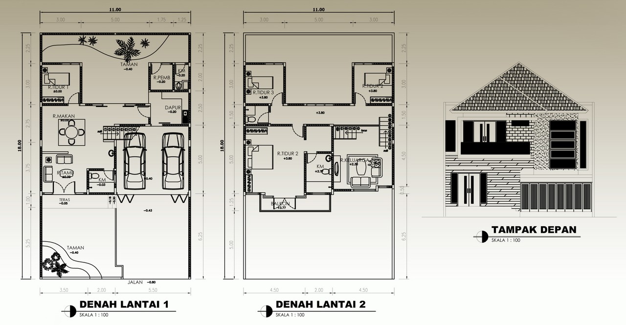 Tampak Depan (kanan): Menunjukkan tampilan fasad depan rumah dari luar, termasuk detail arsitektur seperti atap, jendela, pintu, dan material dinding. Tampak depan ini memberikan gambaran visual bagaimana rumah tersebut akan terlihat dari jalan.
